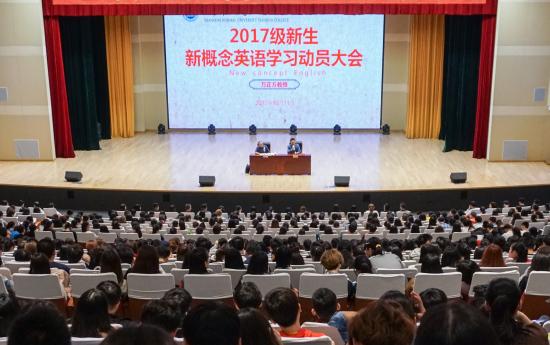 10月11日晚,我校在晖华楼大礼堂召开2017级新生新概念英语学习动员大会。外面秋意浓浓,礼堂内却春意盎然、济济一堂,学校邀请了语言文化学院指导教授万正方老师,为新生作“奋斗的青春最美丽——持之以恒学英语”的主题报告。校党委副书记、学保处处长曹云林,各二级学院党总支书记出席大会,全体大一新生辅导员、1580余名新生、80余名班助理参加了会议。报告会由学保处常务副处长刘天翔主持。