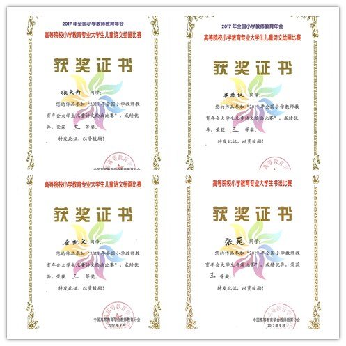本届年会举办的全国高等院校小学教育专业大学生“儿童诗文绘画”和“书法作品”大赛也随即落幕,大赛收到来自全国75所高校共1102件参赛作品。我校教育学院小学教育专业的学生们共有三件作品在此次比赛中获奖。在“儿童诗文绘画”大赛中,吴美仪和张大为同学的《月牙下的夜》,金凯文同学的《蜕变》荣获三等奖。在“书法”作品比赛中,张苑同学的《凉州词》荣获三等奖。在今后的教学工作中,小学教育专业将继续加强学生教师技能的训练及培养,为学生们打下坚实的专业基础。
