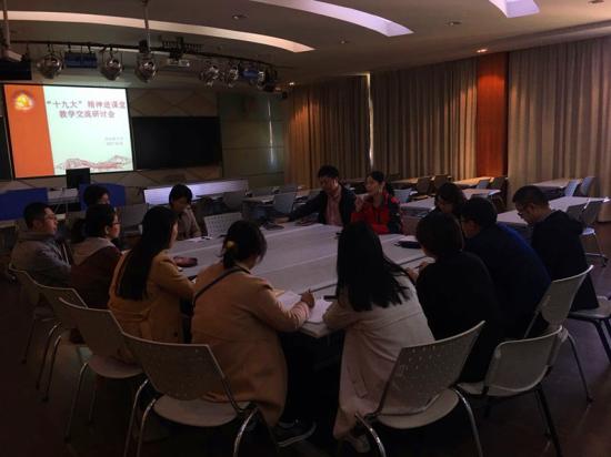 为深入学习宣传贯彻十九大精神,2017年10月31日,思政教学部全体专兼职教师在明华楼五楼会议室召开“十九大精神进课堂交流研讨会”,会议由思政教学部副主任丁彩霞老师主持。黄播、聂晓晶、齐砚奎、张璐、丁彩霞五位老师作为教师代表,分别从本学科教学内容和教学实践出发,就十九大精神进高校思政课的有效途径和方法展开研讨。