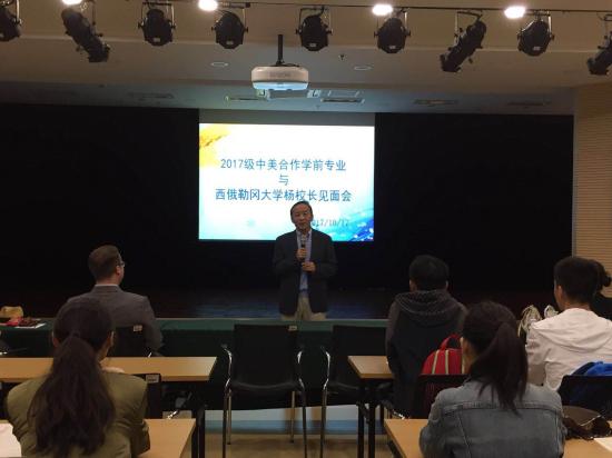 2017年10月17日,美国西俄勒冈大学分管国际交流的副校长Neng Yang应邀来访。教育学院17级中美合作学前专业与美国西俄勒冈大学校方代表在图书馆四楼多功能报告厅隆重举行见面会。国际交流处处长胡珍、教育学院副院长徐娟、中美学前专业主任杨艳、中美合作项目外教Terri、Tim等出席见面会。
