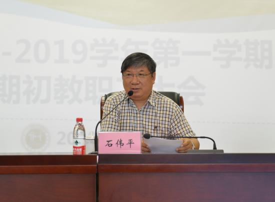 2018年8月31日上午9点,我校2018-2019学年第一学期期初教职工大会在晖华楼报告厅隆重举行。执行董事长石伟平、党委书记陆建非、校长叶才福、总校监郭伟奇、顾问韩晓玉在主席台就座,校务委员会全体领导以及学校全体教职员工出席了会议。会议由执行董事长石伟平主持。
