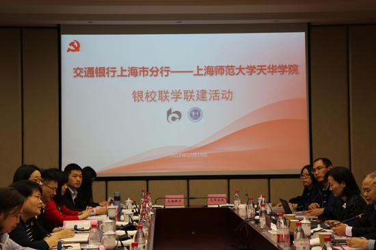 2018年10月19日星期五下午2点整,交通银行上海市分行大客户一部和审计部一行来到我校,与我校开展银校联学联建活动。大客户一部副总经理兼党总支副书记应陵姿、审计监督部副总经理王寒等交行相关员工与我校校长叶才福、党委副书记许岳、副校长朱国权等领导,来到同华楼会议中心一楼会议室召开联学联建交流会,朱国权副校长主持交流会。