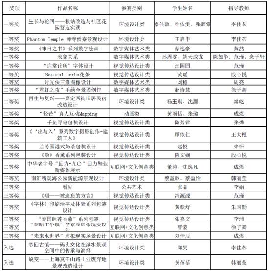 由中共上海市教育卫生工作委员会、上海市教育委员会主办的第三届“汇创青春”大学生作品征集展览活动在2018年4月下旬至6月中旬期间举行。本次活动共征集了上海及长三角地区四十多余所高校大学生在读期间完成的优秀文化创新创意作品三千余件,先后举办分类展览二十余场,参观市民学生数十万人次。我校艺术设计学院学生作品在本次为期两个月展览中脱颖而出,获得了一等奖六项,二等奖九项,三等奖七项,入围奖两项,获奖数创历史新高。具体名单如下: