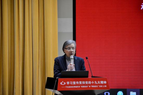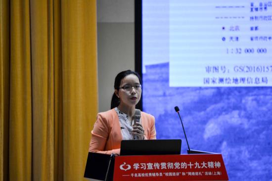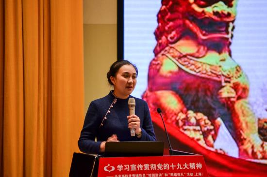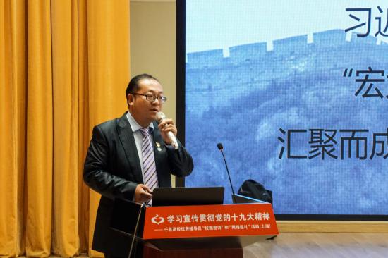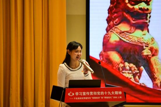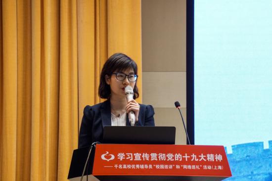 来自同济大学、上海外国语大学、上海理工大学、上海师范大学、上海商学院的五位上海市高校辅导员年度人物李睿、曹姝婧、章少哨、金黎琼、刘俊老师结合自己长期的工作和思考,从时代、使命、成就、坚守、梦想等五个主题,从不同角度,将十九大精神用鲜活的语言、生动的案例进行了深入浅出的讲解,用中国理念开启崭新征程、中国力量绘就宏伟蓝图、中国智慧展现大国担当、中国精神砥砺伟大梦想、中国青年书写人生华章。历时两个半小时的报告启迪智慧、催人奋进。