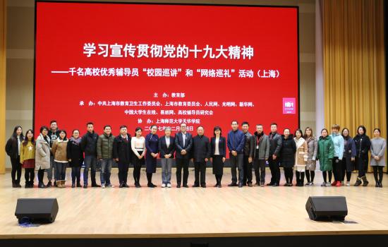12月14日晚上18:00,由教育部主办,中共上海市教育卫生工作委员会、上海市教育委员会承办的学习宣传贯彻党的十九大精神——千名高校优秀辅导员‘校园巡讲’和‘网络巡礼’活动”(上海)在我校晖华楼大礼堂隆重举行。我校党委书记韩晓玉、党委副书记曹云林、宣传部部长齐砚奎、各二级学院党总支书记、思政教师代表、全体正副辅导员、各学院学生党员代表、学生代表共计1300余人参加巡讲活动,巡讲大会由齐砚奎主持。