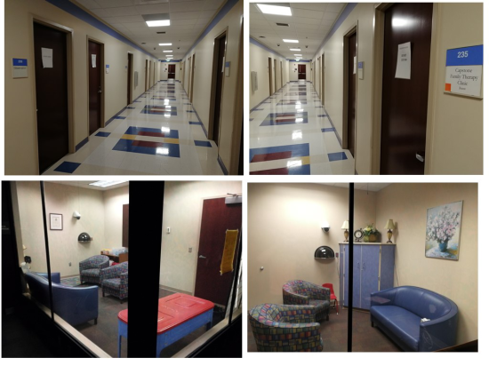 Capstone家庭治疗诊所设有多个设施齐全,适合不同类型心理治疗的治疗室。每个治疗室均配有联网的录音录像设备,整墙单面观察镜和相应的观察室。再训研究生在进行每一次心理治疗时,均需完整拍摄治疗过程,以备之后观看反思以及导师的观察督导。同时,导师及其他学生也可以在观察室内现场观察治疗的过程,随后对个案进行分析讨论。