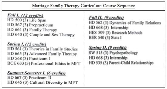 阿拉巴马大学人类环境科学学院,人类发展及家庭研究系的婚姻家庭治疗硕士项目是由阿拉巴马州持证婚姻家庭治疗委员会所审查、认证。本项目旨在培养学生全面了解家庭治疗理论和相关研究、帮助学生发展提供和评估婚姻家庭治疗的能力、促进学生作为婚姻家庭治疗师的专业身份的发展。在为期两年的教学中,学生按照课程设置完成各课程理论知识的学习,以及心理治疗的临床实习工作,具体课程设置见表1。其中,主要教授的心理治疗方法包括认知行为家庭治疗、结构式家庭治疗、策略式家庭治疗、焦点解决治疗、游戏治疗和叙事治疗等。在学习各治疗模式和临床实践中,使学生可以发展出拥有个人独特治疗风格的治疗师。