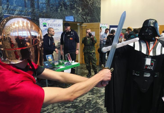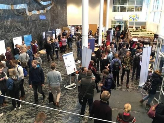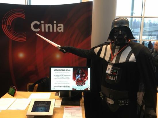 在庆典结束后的一周,2017年11月23日的10:00-15:00,信息技术学院Agora主楼又迎来了一场IT专场招聘会,近30家芬兰的IT公司到校和学生进行现场交流,涉及到运动、军事、游戏设计等多个领域。和国内招聘会现场投递简历的火爆截然不同,到场的学生基本不用携带纸质简历,到校招聘的企业展位前都准备了糖果、巧克力或是一些小礼品,学生们根据自己的兴趣和招聘人员随意地进行交谈,了解公司和行业需求,双方达成意向后会互留联系信息。一家名为Cinia的电信公司招聘软件人才,除了打出招聘广告,还在现场玩起了Cosplay,工作人员扮演的黑武士Darth Vader在Agora主楼大厅里发公司宣传单、大摆游戏造型,幸运的学生还可以获得该公司《星球大战》内部演出的门票。