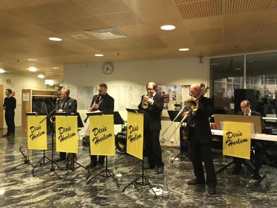 2017年11月17日,来自芬兰IT行业的技术大咖们齐聚于韦斯屈莱大学信息技术学院的Agora会场,访学团的三名成员也受邀出席了这次会议。会议现场全程芬兰语,与会代表们和学院师生一起回顾了学院的历史发展,探讨行业最热门的趋势,策划校友建设的后续活动;会议休息期间学院准备了美味的甜点和咖啡,配上乐队演奏,让整个会议变得生动惬意。