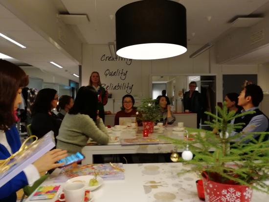 2017年11月30日下午三点,访学团受邀参加了EduCluster芬兰有限公司举行的圣诞节聚会。该公司是一家专业的教育结构,属于于韦斯屈莱大学,于韦斯屈莱应用科学大学和于韦斯屈莱教育集团,经营和服务的地理区域主要集中在海湾合作委员会国家、亚洲和拉丁美洲,本次访学团成员在芬兰的培训事宜就是由该公司负责组织。组织此次活动的Sanna女士代表公司给大家送上了精心准备的圣诞礼物,并和大家一起交流在芬兰的培训情况,一起参加活动的还有六名来自韩国的小学教师,大家聚在一起共同庆祝即将开始的圣诞月,共同感受和交流不同国家的教育和文化。