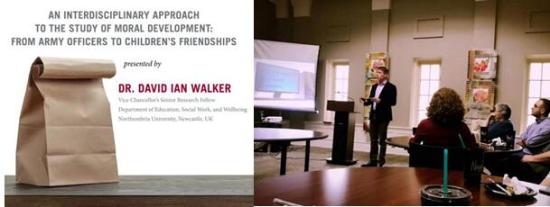 本次报告会主讲Dr. David Ian Walker曾在英国军队从事心理学服务长达23年,后转向学术研究,跨界到“儿童道德发展”领域。他将之前研究中总结出来的优秀初级军官六项重要特质“合作”、“诚信”、“求知欲”、“公正”、“毅力”“勇敢”迁移到儿童心理发展领域,采用问卷访谈形式,探讨儿童对这六种品质的理解及自身发展水平之间的关系。