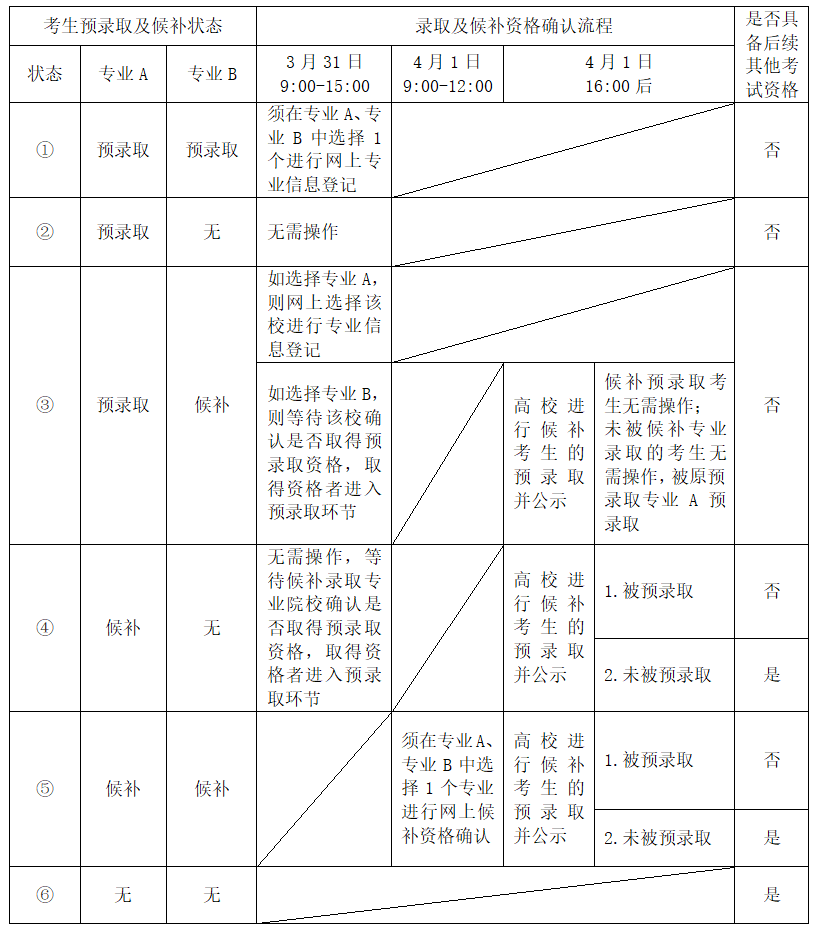 5. 取得两个专业候补录取资格的考生,须在4月1日9:00-12:00,在网上选择一个专业进行候补资格确认,如院校确认最终取得预录取资格,无需操作,默认被预录取(注意:确认候补资格的考生不一定会被录取,要根据该校预录取考生的录取确认情况而定)。